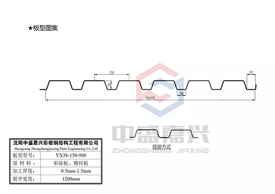 YX38-150-900型开口压型钢板,肋高为38mm,每个波距为150mm,整板有效宽度为900mm,展开宽度为1200mm,有效使用率为75%。