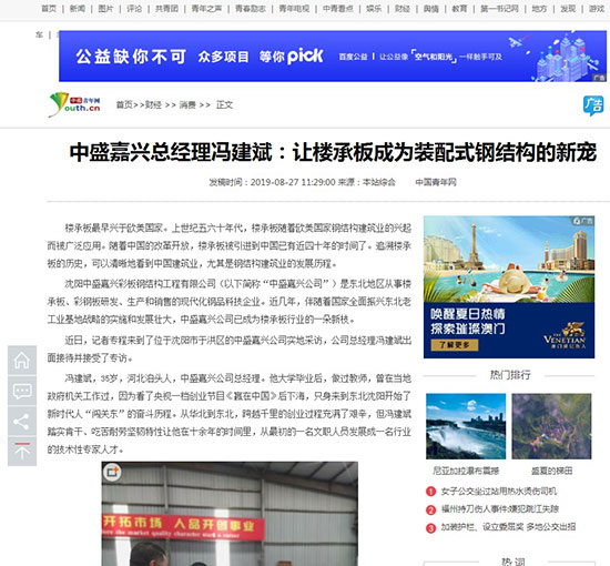 近日,共青团沈阳市委组织媒体记者对活跃在沈阳市各条战线上的优秀青年进行了采访报道,沈阳中盛嘉兴公司总经理冯建斌同志做为往年的“沈阳市五四青年奖章”获得者,尤其受到采访记者的重视,《中国青年网》记者专程莅临沈阳中盛嘉兴公司,对冯建斌总经理进行了专访,采访内容发表在2019年8月27日《中国青年网》。