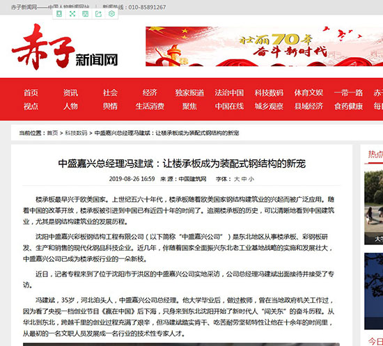 沈阳中盛嘉兴彩板钢结构工程有限公司(以下简称“中盛嘉兴公司”)是东北地区从事楼承板、彩钢板研发、生产和销售的现代化钢品科技企业。近几年,伴随着国家全面振兴东北老工业基地战略的实施和发展壮大,中盛嘉兴公司已成为楼承板行业的一朵新枝。