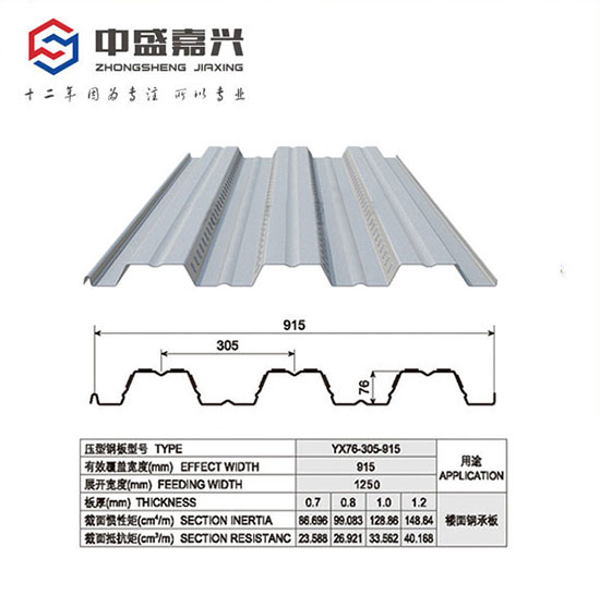 0.8mm厚YX76-305-915楼承板,是采用0.8mm厚,1250mm宽的镀锌卷辊压成型的一款开口式楼承板,成型之后的效宽度为915mm,波高76mm,波距305mm。沈阳中盛嘉兴生产的YX76-305-915楼承板可加工厚度为0.8mm、1.0mm、1.2mm。