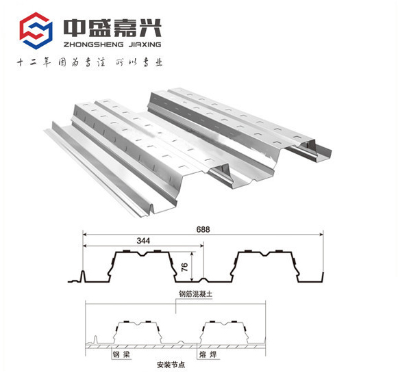 YX76-344-688楼承板是一款非常传统的板型,是最早的一批楼承板型号之一,也是76波高3W楼承板常见板型之一,所以时代再怎么发展,688压型钢板也不会被淘汰。688楼承板在上个世纪80年代由欧美传入中国,其优点是施工速度快,承载能力强,抗震效果好。沈阳中盛嘉兴可加工YX76-344-688楼承板厚度为0.8mm-1.5mm。