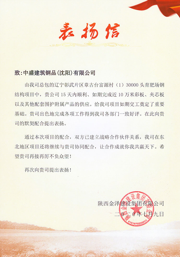 2020年7月9日,中盛建筑钢品(沈阳)有限公司收到一封来自古城西安的《表扬信》,信中对中盛公司在新希望彰武章古台富源项目中的出色配合提出表扬,正是中盛公司的默契配合和及时供应,保证了该项目20天25000平方米建设任务如期顺利交工。