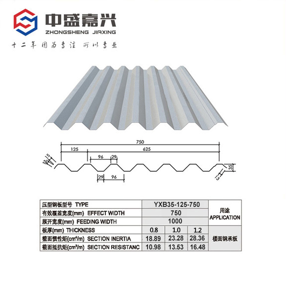 YX35-125-750(v125)-1.0mm压型钢板规格参数及每平方米重量,YX35-125-750(v125)-1.0mm压型钢板采用厚度为1.0mm,宽度为1000mm的镀锌板或者彩钢板压型而成,成型之后的波高为35mm,波距是125mm,有效宽度是750mm。YX35-125-750(v125)压型钢板是常见的压型钢板型号之一,东北压型钢板加工基地-沈阳中盛嘉兴可加工YX35-125-750(v125)压型钢板厚度为0.4~1.5mm。