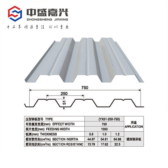 YX51-250-750楼承板产品特点:重量轻、强度高、承重大、抗震性好;施工简单快捷、拼装方便;取代激进模板,改善激进模板缺点;可用作为结构强度的一部分,可减低材料成本;易于配钢筋、配线、配管的施工;外观整洁美观。