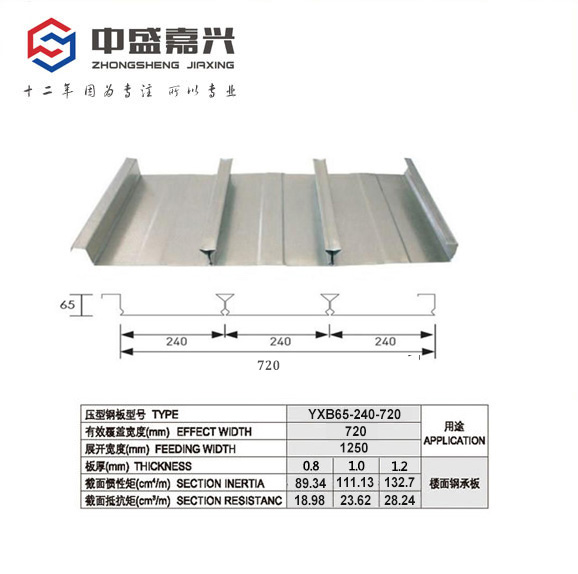 yxb65-240-720闭口压型钢板板型合理,强度大,覆盖率高,表面打起凸包增加与混凝土结合力,与混凝土钢筋结构作弯矩抵抗,性能良好,压型板组合楼盖施工简便快捷,不用拆模和多层同时施工,提高施工速度,缩短施工周期,免除天棚粉刷的投资和时间,抗震能力加强、具有优良的耐火性能。