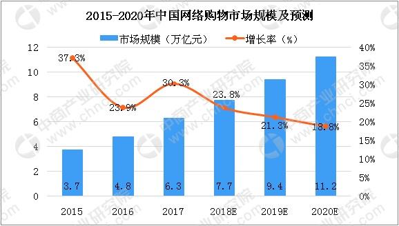 数据显示,2017年中国网络购物市场交易规模达到6.3万亿元,与2016年相比增长30.3%,增长有所回暖。随着网络购物市场线上线下融合,行业稳定发展,预计2019年中国网络购物市场交易规模将达到9.4万亿元。