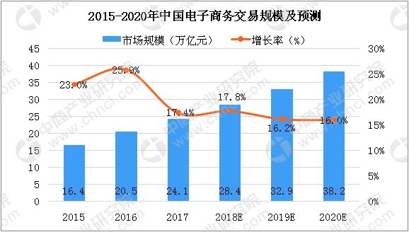 数据显示,预计2017年中国电子商务整体交易规模将达24.1万亿元,增长17.4%,随着电商商务行业的逐步完善,预计2019年中国电子商务交易规模将超30万亿元,同比增长为16.2%。
