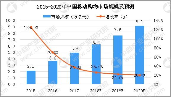 随着智能手机的大量推广和普及,移动互联网快速发展,数据显示,2017年中国移动购物市场交易规模达到4.9万亿元,同比增长37%,随着人口红利的消退,增速逐渐放缓但仍保持较高的增长水平,预计2019年中国移动购物规模将达到7.6万亿元,增长率达到22%。