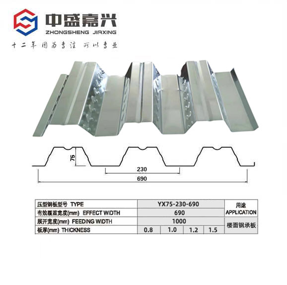 690楼承板(YX75-230-690楼承板)又称作YX75-230-690型钢承板、YX75-230-690型压型钢板,它的肋高为75mm,由三个波组成,每个波距为230mm,整板宽度为690mm。东北楼承板生产加工基地-沈阳中盛嘉兴公司是东北地区为数不多的配备有YX75-230-690楼承板设备的厂家之一。