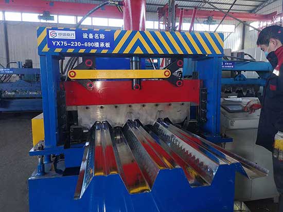 日前,沈阳中盛嘉兴彩板钢结构工程有限公司(以下简称:中盛嘉兴)新购进的YX75-230-690楼承板设备到达中盛嘉兴工厂,经过厂家工程师和我司技术人员两天紧锣密鼓的调试,设备已具备正常生产条件,第一批发往吉林省的订单开始生产。